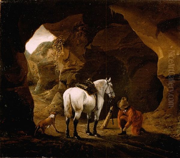 A Man Doing Up The Lace Of His Shoe, With A Grey Horse And A Dog At The Entrance To A Cave