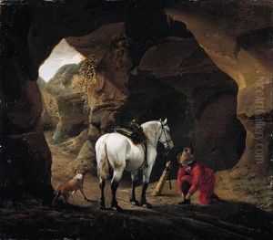 A Man Doing Up The Lace Of His Shoe, With His Grey Horse And Dog, At The Entrace To A Cave