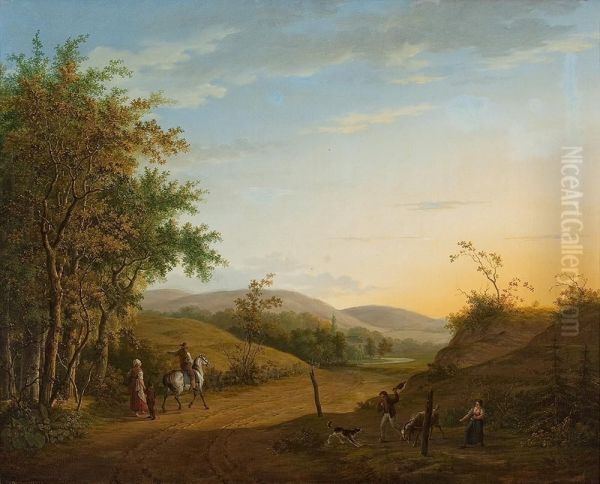 Waldweg Mit Reiter Und Landvolk Bei Sonnenuntergang