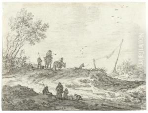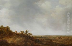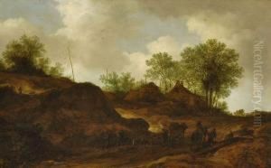 A Wooded Landscape With Dunes And Figures By A Cottage
