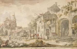 Herdsmen And Animals By Trees; And Peasants And Wagons Approachinga Village