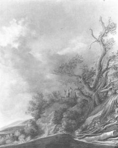 Anhohe In Weiter Landschaft Mit Haus, Pferdefuhrwerken Und Figurengruppe