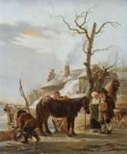 Winter Landscape, With Peasants On A Windswept Road, And A Village Behind