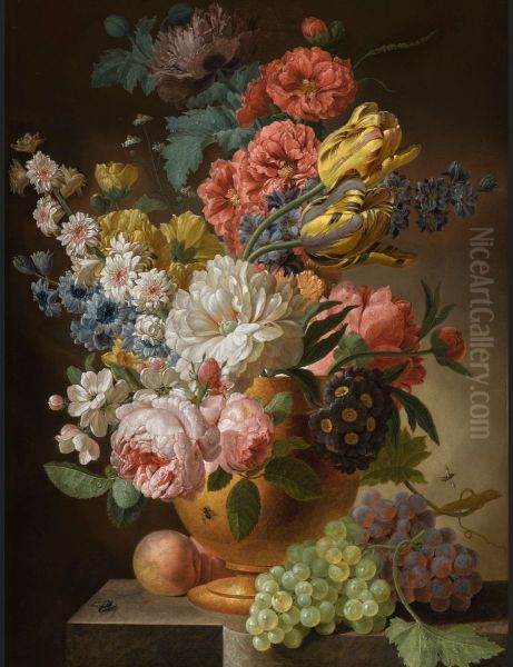 Still life of roses, tulips, carnations and other flowers in an urn on a stone ledge, with peaches and grapes