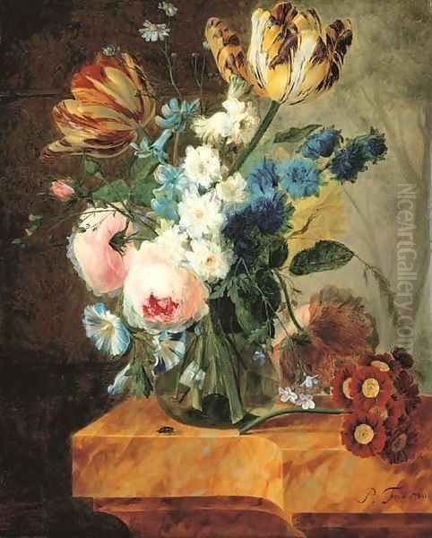 Bring the timeless beauty of Pieter Faes's Tulips, roses, morning glory, campanulas and other flowers in a glass vase with primulas on a marble ledge, a wooded landscape beyond into your home with a handmade oil painting reproduction. Carefully recreated on canvas by skilled artists using traditional techniques, this piece captures the delicate brushwork, subtle light, and vibrant color of the original masterpiece. With museum-level quality and rich texture, it brings elegance and artistic depth to any space. Enjoy free shipping and make this masterpiece a part of your personal collection.