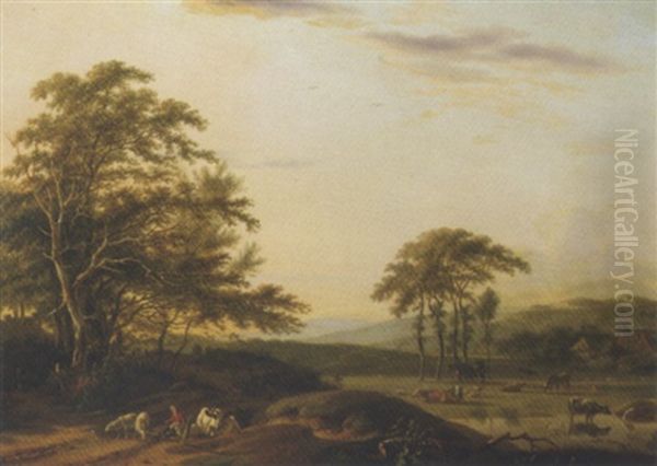An Italianate River Landscape With A Shepherd And Cattle