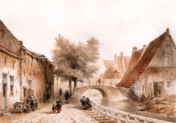 Dorpsgezicht Met Figuren Bij Een Bruggetje