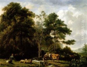 Drovers With Cattle, Sheep And A Dog In A Landscape