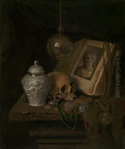 A Vanitas: A Jar, A Skull, A Medal And Other Objects On A Draped Table