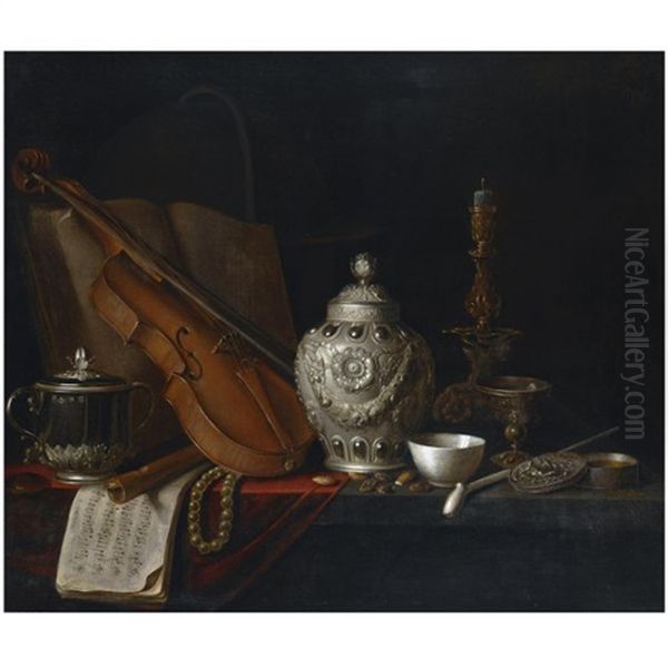 A Still Life With A Silver Ginger Jar, A Violin, A Pearl Necklace, A Recorder, Music Sheets, A Silver Porringer, A Book, A Globe, A Gilt Candlestick, A Glass, A Porcela