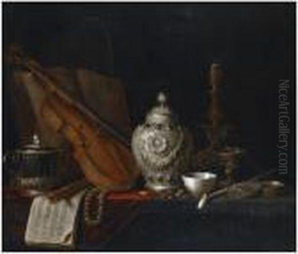 A Still Life With A Silver Ginger Jar, A Violin, A Pearl Necklace, A Recorder, Music Sheets, A Silver Porringer, A Book, A Globe, A Gilt Candlestick, A Glass, A Porcelain Bowl, A Pipe, A Silver Box And Almonds, All On A Wooden Table, Draped With A