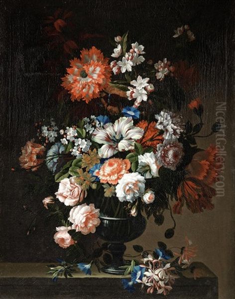Roses, Tulips, Carnations And Other Flowers In A Glass Vase, With Honeysuckle And Morning Glory On A Stone Ledge; And (2)