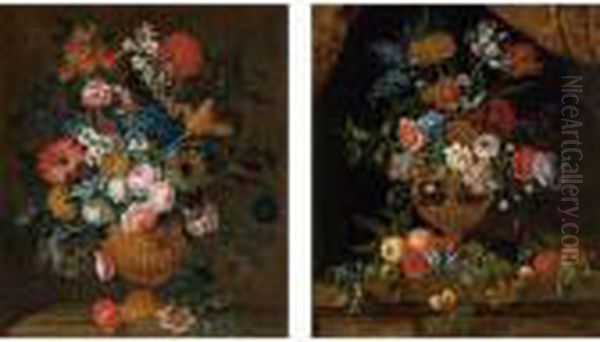 Still Life Of Various Flowers In An Ornate Vase Resting On A Ledge; Still Life Of Various Flowers In An Ornate Vase Resting On A Ledge Strewn With Fruit