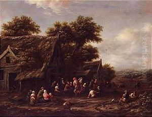 An Interior Scene With Figures Gathered Around A Table