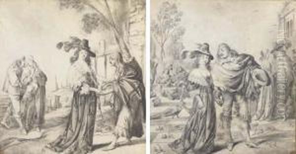 An Elegant Lady Giving Alms To A Beggarwoman, An Amorous Couplebeyond; And An Elegant Company In A Pleasure Garden Strewn Withflowers