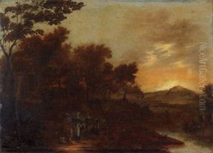 An Evening Landscape With Fishermen And Other Figures Beside A River