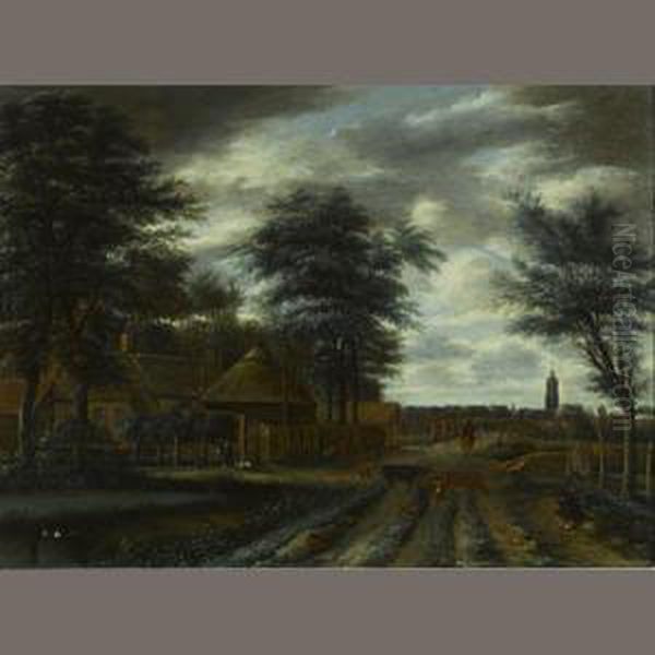 A Country Lane With A Farm And Figures And Cattle In The Foreground