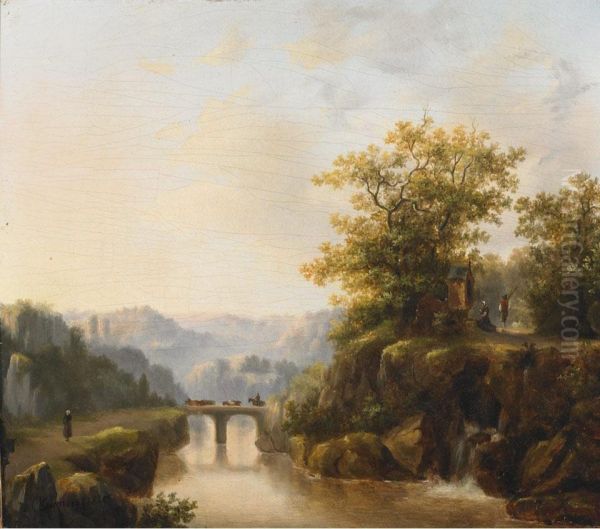 Figures At A Bridge Over A River Landscape