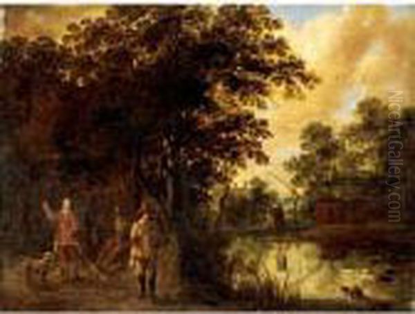 A River Landscape With Three Huntsmen With Their Dogs