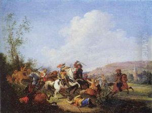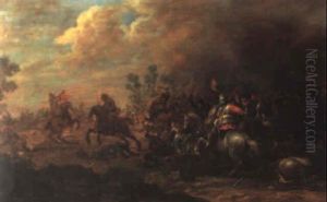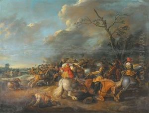 A Cavalry Engagement Upon A Hillside Overlooking A Town