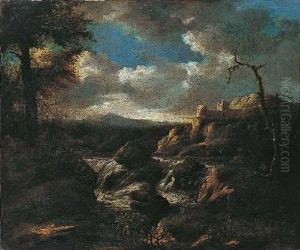 A Stormy Italianate Landscape With Drovers And Their Animals Fording A Stream