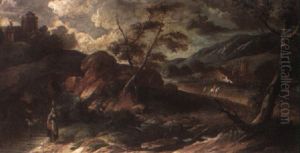 Banditti By A Torrent, A Tower And Mountains In The Distance