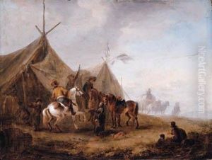 A Military Encampment With Horsemen And Other Figures Beside A River