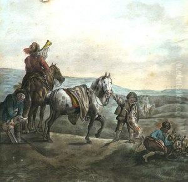 A Horseman, Hunterswith Dogs And Falcons On A Bluff With A Landscape Beyond