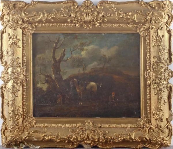 A Peasant Fishing With Grey Horse And Dogs In A Hilly Landscape