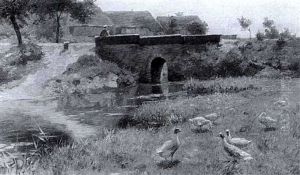 A Rocky River Landscape With Travellers On A Track Crossing A Wooden Bridge