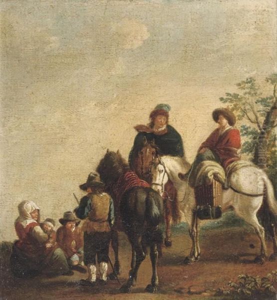 A Wooded Landscape With Figures On Horseback At Rest