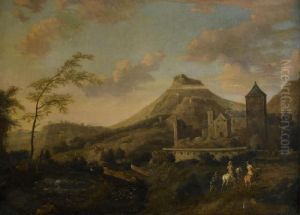An Italianate Landscape With Two Riders And Other Figures Beneath Ruined Buildings