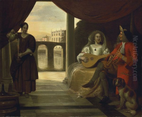 Elegant couple playing music on a terrace, with a maidservant pouring wine