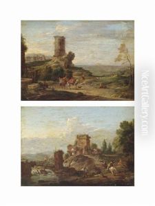 Horsemen And Travelers Standing In Front Of An Encampment, A View Of A Ruined Tower Beyond
