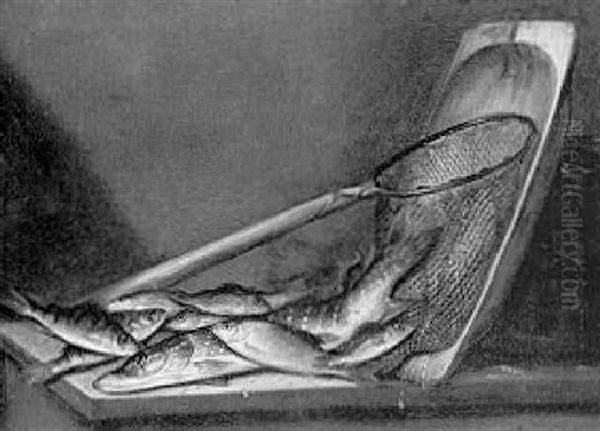 A Still Life Of Fresh-water Fish, A Net And A Wooden Tray On A Stone Ledge