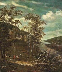 An Extensive Wooded River Landscape With A Shepherd Resting On The Riverbank