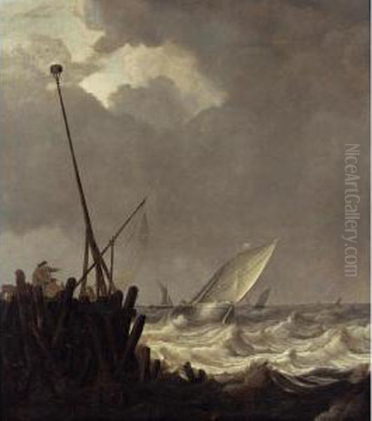 Ships In Stormy Seas With Fishermen Standing At A Jetty