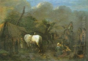 A Military Encampment In A Wooded Landscape With Sheep And Cattle Grazing, And Mounted Cavalry Behind