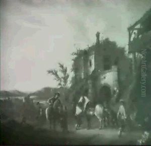 Horsemen At A Blacksmith's Forge, With A Horse Being Shod