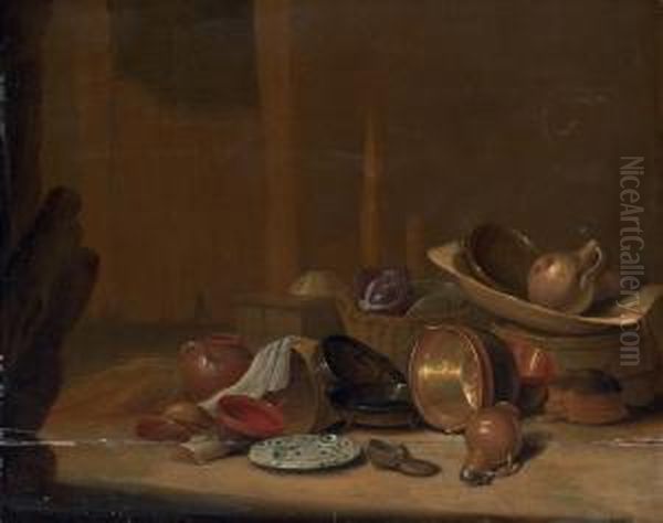 Cabbages In A Basket, A Strainer And An Earthenware Jug In A Wooden Washtub On A Barrel, With Copper Buckets, Pots And Pans, A Westerwald Stoneware Jug, A Shoe And A China Plate Nearby, In A Barn