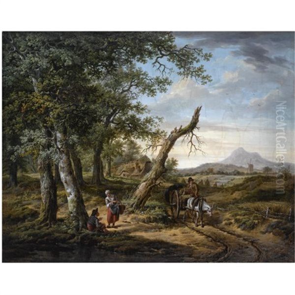 A Wooded, Hilly Landscape With A Farmer On A Horse-drawn Cart On A Muddy Path, Peasants Resting Nearby, A Farmhouse Beyond