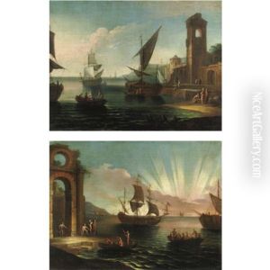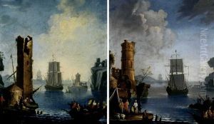 Marine Con Barche, Figure, Mercanti Abbigliati All'orientale E Rovine (pair)