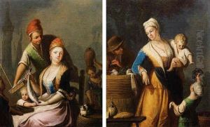 Peasents Dancing In A Grotto (+ An Interior With Domestic Activities; Pair)