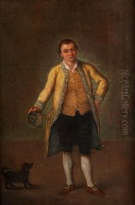 Portrait Of A Gentleman In A Gold-embroidered Waistcoat And Brown Coat, Holding A Cane, His Dog Beside Him