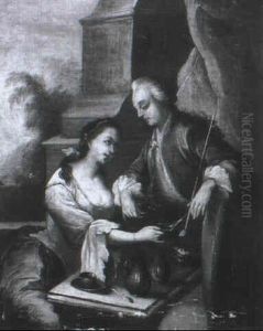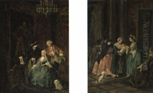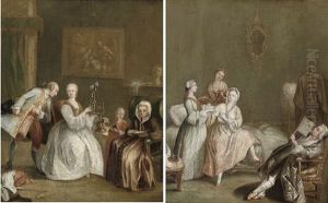 Violinist And A Cellist Playing For Two Ladies (+ Lady Having Her Hair Coiffured, Seated Beside A Child And A Man, Two Maids Beyond; Pair)