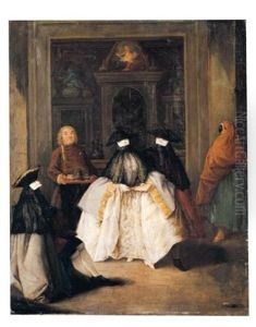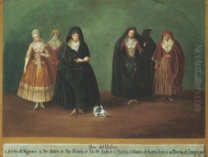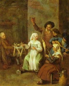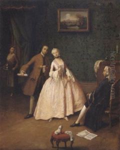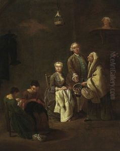 An Interior With A Boy-servant Bringing A Young Lady A Bonnet, An Elderly Lady Seated Nearby And A Maid Hanging Laundry Beyond (la Modista)