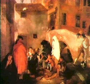 Scena Popolare Veneziana Con Venditore Di Panini Vicino A Un Ponte