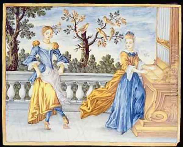 Two young women one playing the organ and one dancing 1630