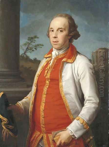 Portrait of Robert Udny (1722-1802), half-length, in a gold-trimmed coat, holding a hat and gloves in his right hand, the Temple of the Sybil at Tivol