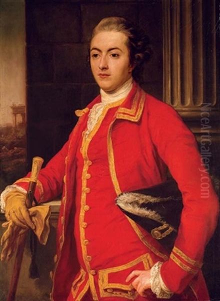 Portrait Of A Gentleman (john Sadler ?), In A Red Coat, Holding A Cane And Glove In His Right Hand, A Tricorn Hat Under His Left Arm, A Landscape Beyond